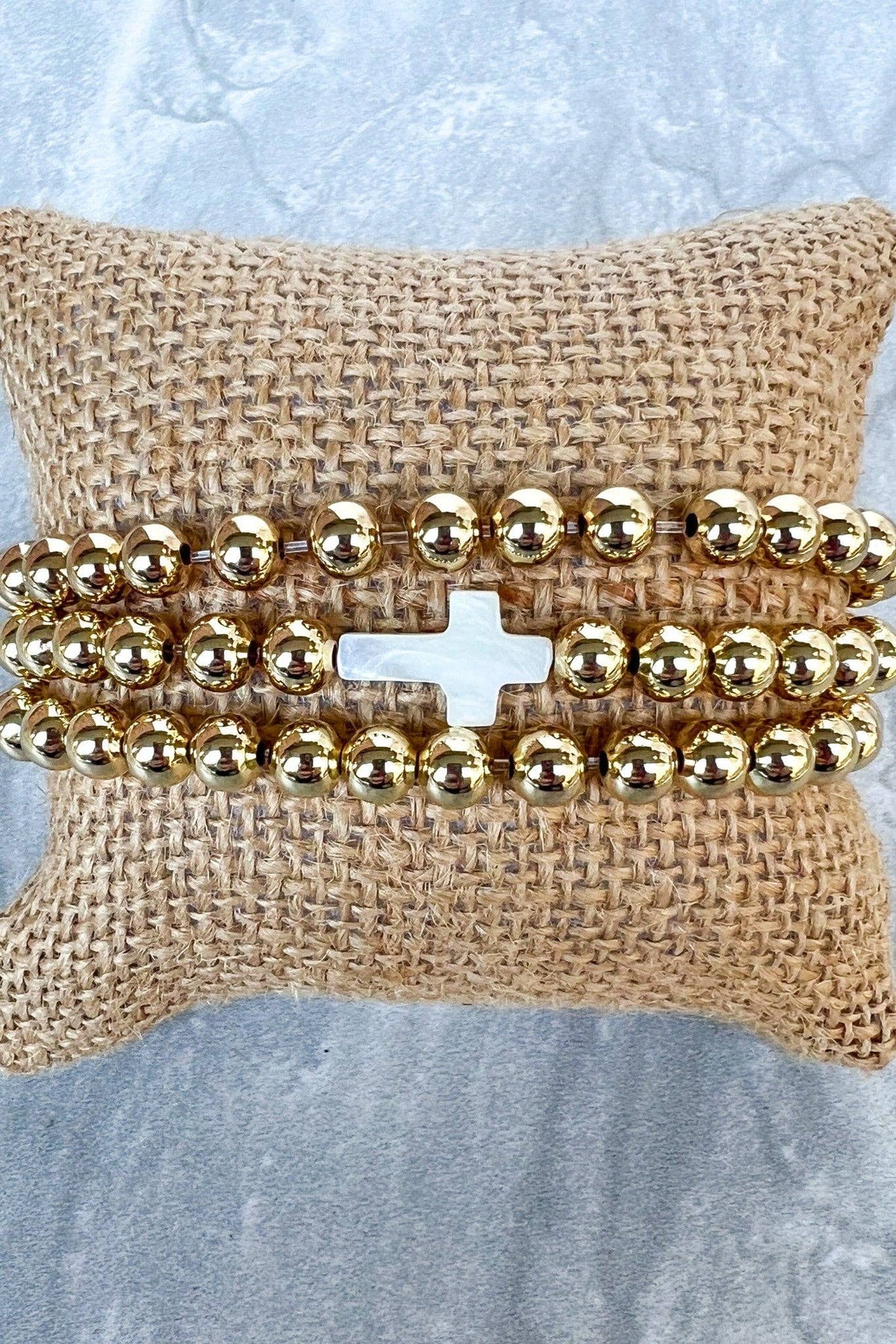 3 gold beaded stretchy bracelets, with 1 featuring a small white marble cross. Pairs perfectly with the Pria Necklace. Approx. 3" circumference