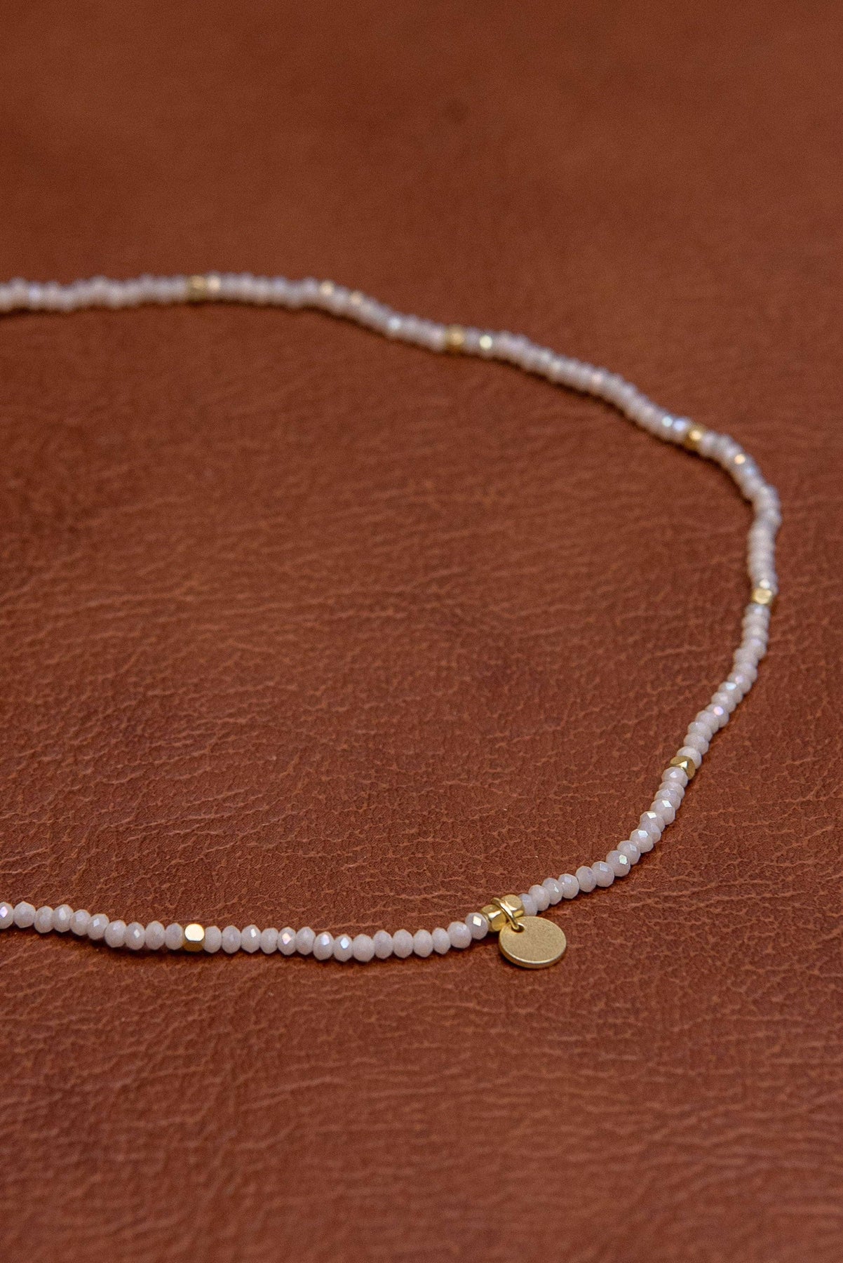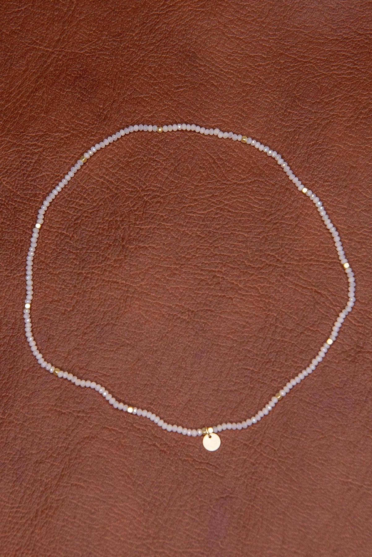 Stretchy ivory seed bead choker with mini worn gold disc charm. Dainty and so cute!