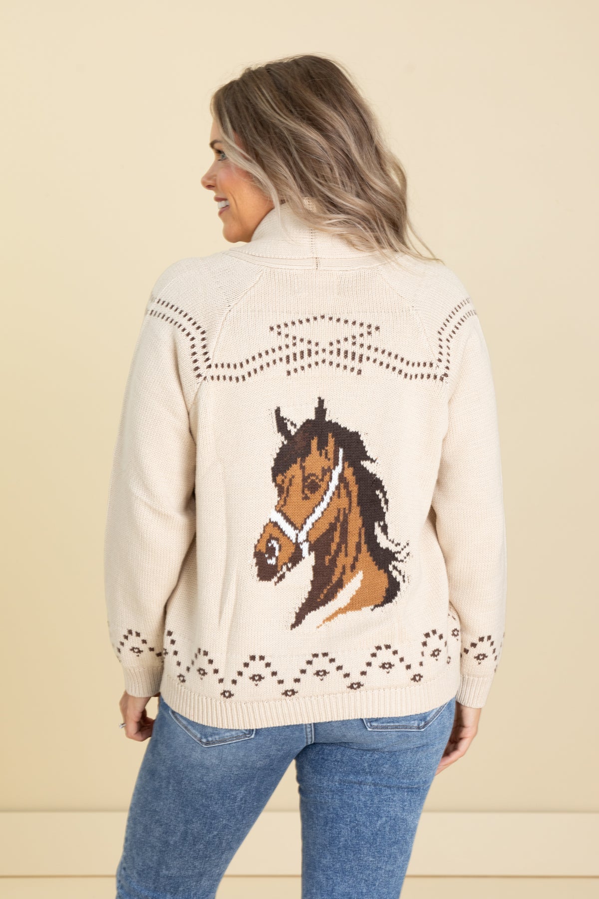 Bring a touch of Western charm to your wardrobe with this soft + cozy knit horse cardigan, perfect for playful layering and standout style. *pairs with our French Roast Tank