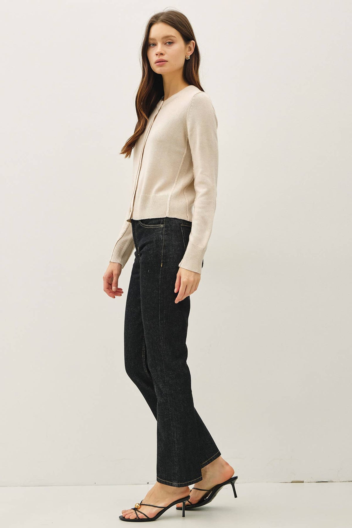 Soft touch, lightweight wool blend cardigan in oatmeal with tortoise front buttons closure, exposed seam detail and a crew neckline.